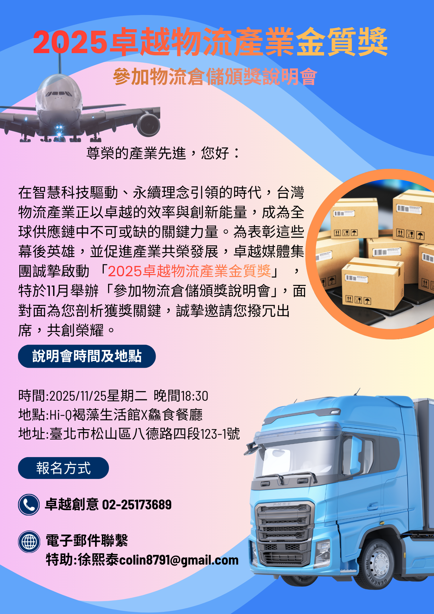 卓越媒體集團將於2026/01/06舉辦卓越2025物流產業金質獎 有鑑於是初次徵集產業先進來參與,特於 2025/11/25 晚間18:30 舉辦說明會 地點: Hi-Q褐藻生活館X鱻食餐廳 臺北市松山區八德路四段123-1號