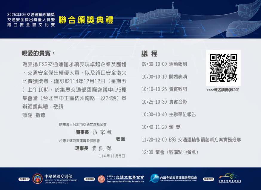 面對全球永續轉型與淨零減排的挑戰,企業正積極尋求行動方案,以實踐永續經營與淨零承諾。其中,交通運輸產業在ESG(環境、社會、治理)發展中扮演舉足輕重的角色,從供應鏈減碳、智慧運輸到永續物流,交通運輸不僅影響經濟發展,更是邁向淨零未來的關鍵。本會秉持「推動產業永續運籌、鏈結淨零減碳趨勢」,自2023年起舉辦「ESG交通運輸永續頒獎典禮」,以表揚在節能減碳、社會責任、治理創新與永續經營等領域具有卓越貢獻的企業與機關構。第二屆活動延續首屆成果,持續推動ESG理念的深化與實踐,透過公開表揚與經驗交流,促進產官學研跨界合作,形塑交通運輸產業的永續,展現台灣在全球綠色運輸發展中的堅實行動力與國際影響力。誠摯邀請各界共襄盛舉,共同見證持續為交通永續努力的企業典範。